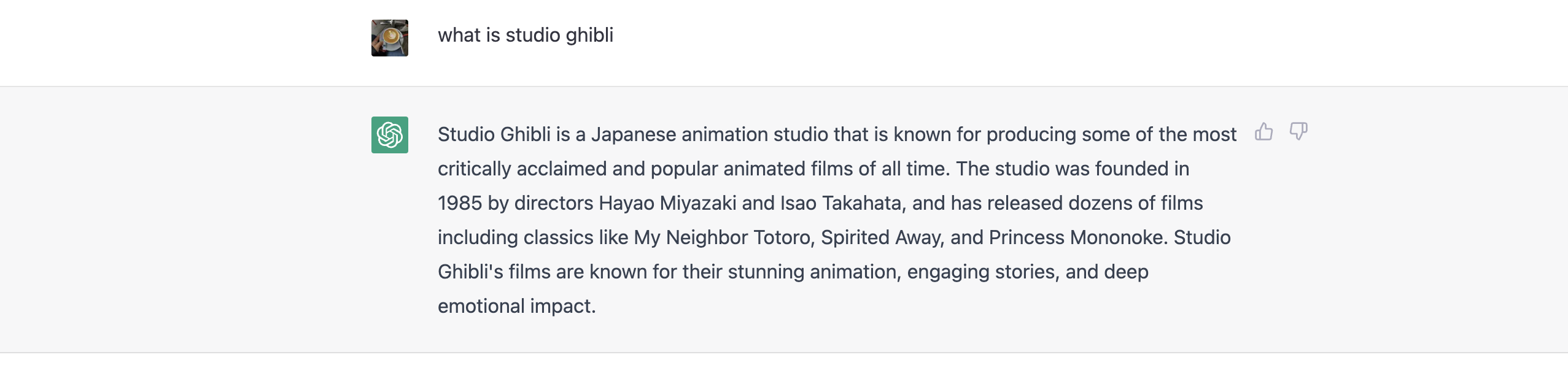 ChatGPT gave a quick and summarized paragraph telling me exactly what I need to know: what Studio Ghibli is, when it was founded, and some of its most popular movies.